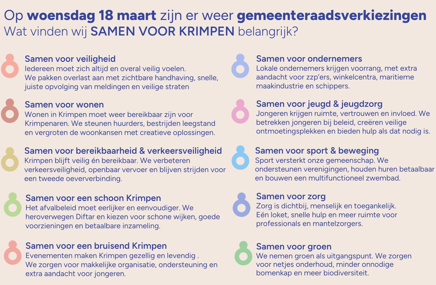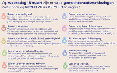 Ons verkiezingsprogramma is niet achter een bureau geschreven, maar ontstaan uit ruim honderd gesprekken met inwoners, verenigingen, ondernemers en (maatschappelijke-) organisaties. Hun ervaringen, zorgen en ideeën vormen de basis van de keuzes die wij maken voor de toekomst van Krimpen aan den IJssel.
