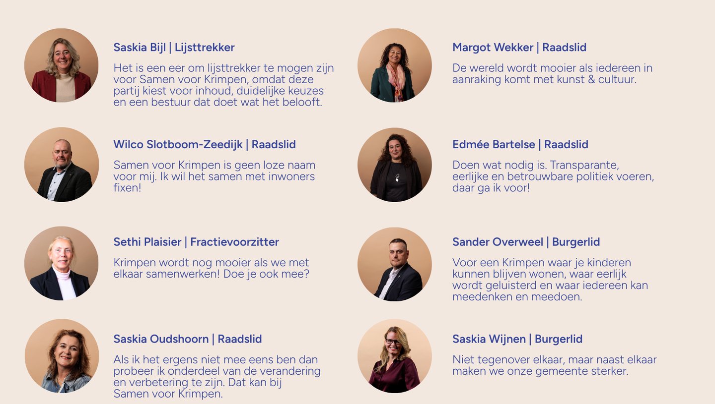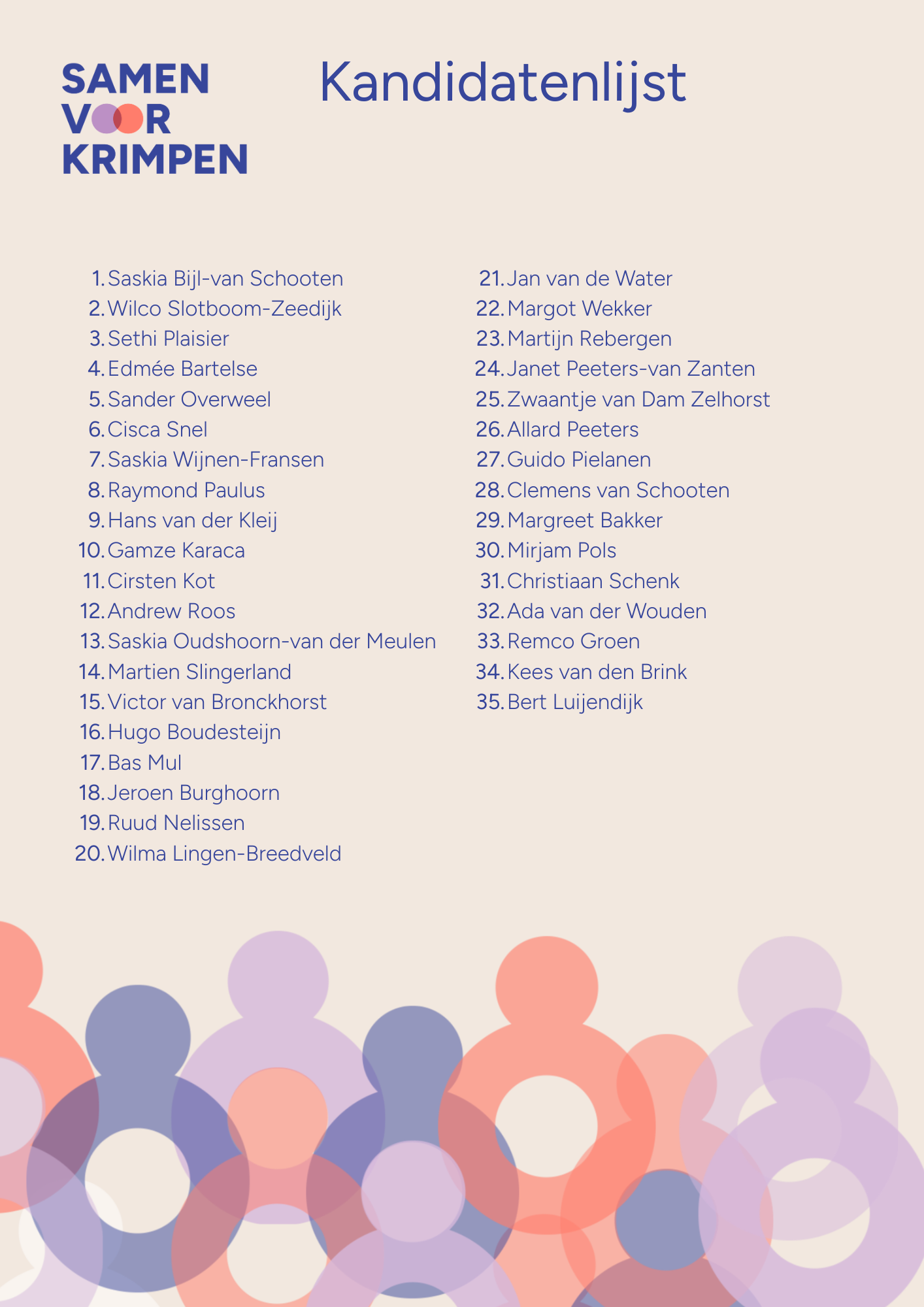 Met trots presenteren we onze kandidatenlijst: een groep betrokken, enthousiaste en diverse Krimpenaren die zich met hart en ziel willen inzetten voor jouw wijk en onze gemeente.